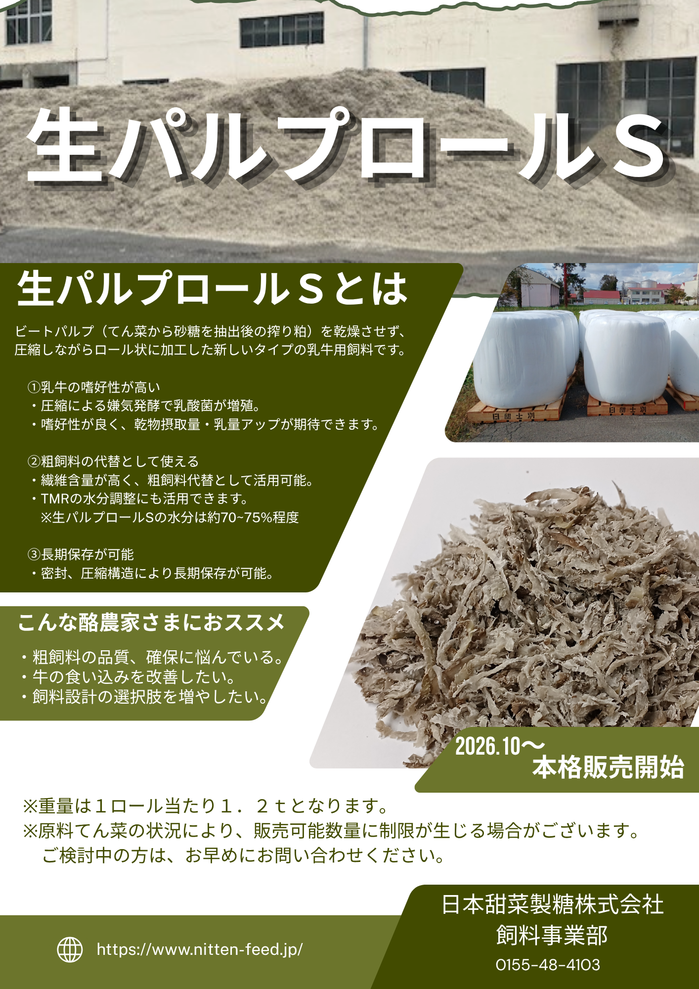 「生パルプロールS」はビートパルプ(てん菜から砂糖を抽出後の搾り粕)を乾燥させず、圧縮しながらロール状に加工した新しいタイプの牛用飼料です。